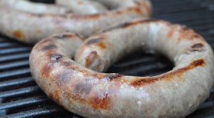 Grillet medister med nye kartofler, brun sovs og rødkål