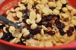 - Tranebær og hvid chokolade tilsættes. Hasselnødderne hakkes groft og fyldet tilsættes dejen. Rør, så fyldet fordeles godt i dejen.