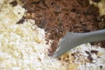• Bland salt og kardemomme med hvedemelet og rør det i, lidt efter lidt. Nøjes med så lidt mel som muligt. Dejen skal kun lige kunne slippe fad og fingre. Rør chokoladen i undervejs