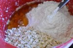 - Bland natron og salt med hvedemel og rør det i dejen. Rør havregryn og sirup i