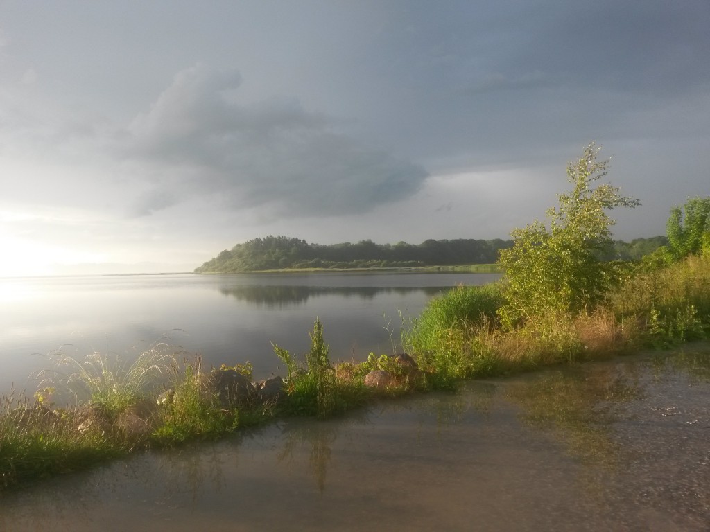 Vi kørte til Mariager i syndflod og se lige hvilken åbenbaring der mødte os. Himlen flækkede og solen brød frem og skabte det mest fantastiske lys og oh, hvilken himmel. Helt fantastisk! Jep, vandet i forgrunden er en gigantisk vandpyt. Vi kom ikke tørskoede til båls 😉