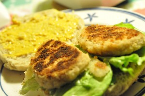 Burgerbollerne blev lavet igår, og bare lunet i ovnen. En pakke kylletter blev åbnet og stegt i lidt olie, frisk grønt blev vasket. Den gode karrydressing fra Heinz fundet frem. Vupti. Så var der kyllingeburger a la kyllette.