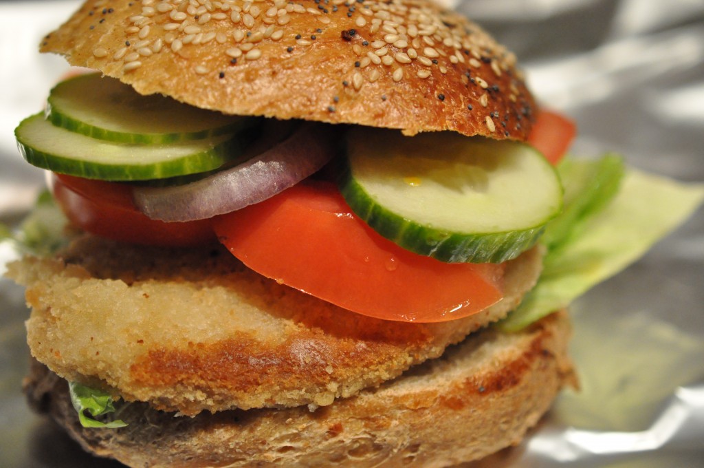 Dagen var en heldig dag på madfronten. Uden de store armbevægelse kunne vi hive sådan en gigantisk lækker kyllingeburger i land.