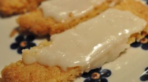 - Rør romglasuren imens stængerne bager. Hæld flormelis i en skål og tilsæt romessens og evt. vand. Du kan smage til undervejs og røre glasuren færdig med enten vand eller romessens. Glasuren skal være lidt tyk.