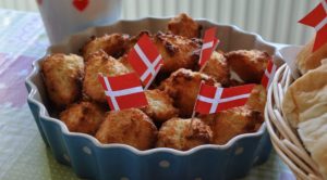 Ovenfor ses kokosmakroner med smør. Alle blev spist. Heldigt fotografen nåede at få taget et billede inden gæsterne gik ombord i kagefadet 😉