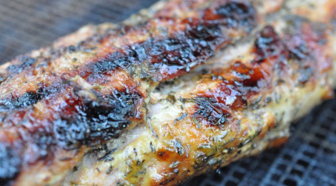 Grillet sennepsmarineret svinemørbrad og grillede timiankartofler.