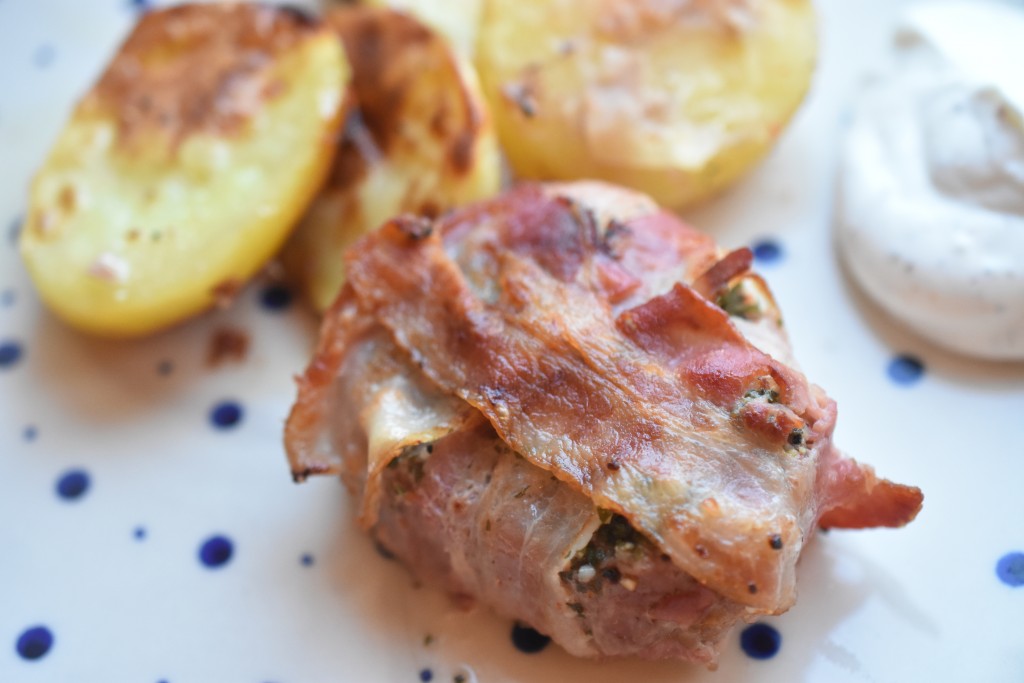 Sprøde kartofler, og sprødstegt steak med hvidløgssmør i en “baconpakke”. En let og lækker menu som jeg tænker vil vække jubel hos langt de fleste?