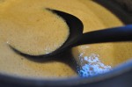 - Tilsæt 150 gram sukker (gerne rørsukker. Du kan også bruge brun farin). Lad sukkeret smelte med, sammen med smørret. Tilsæt sirup, vand og natron og tag herefter hurtigt gryden af varmen.