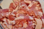 - Tag baconternene op med en hul-ske og læg den til afdrypning på en tallerken beklædt med køkkenrulle.