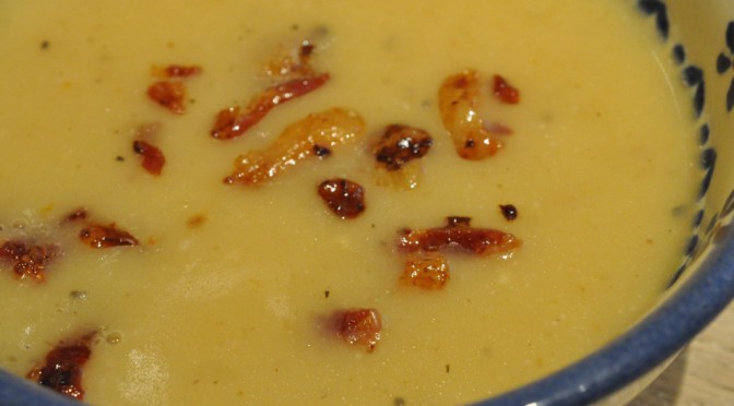 En kartoffelsuppe er mild i smagen, så børn kan saftens spise med og du skal lave rigeligt bacondrys, for der bliver spist MEGET bacon!.
