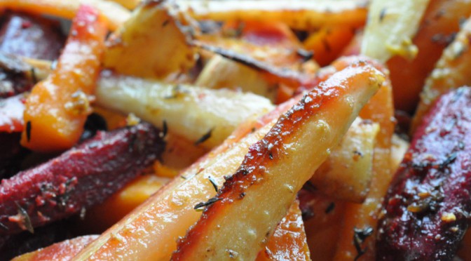 Uhm – en magisk marinade med sennep, honning og timian som du kan vende rodfrugterne i, og som giver den LÆKRESTE smag.