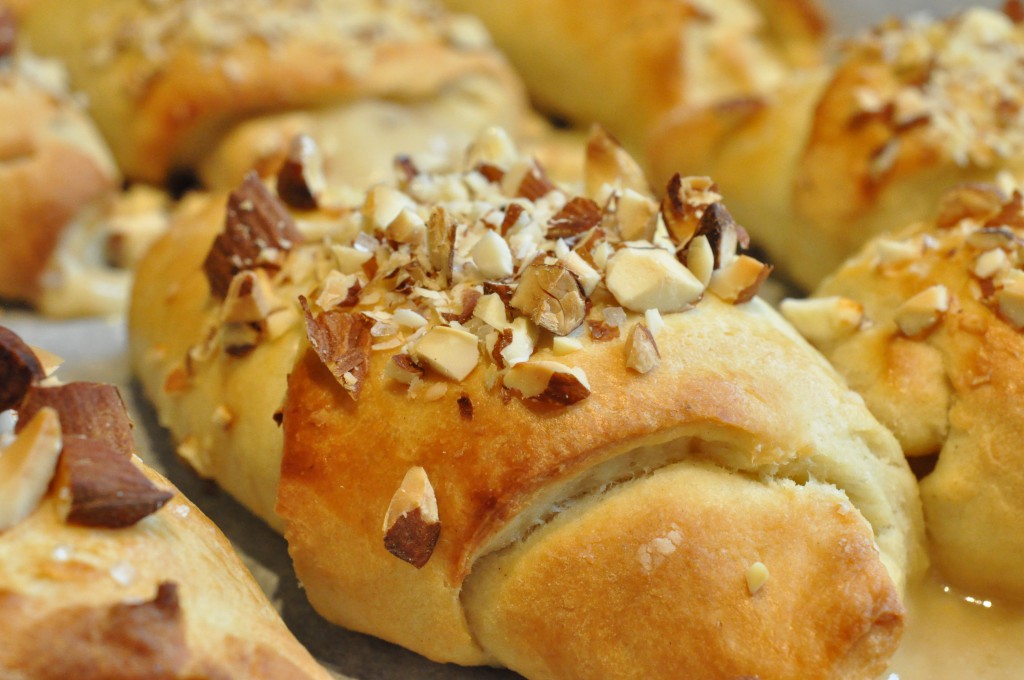 Smørbagte kærnemælkshorn med marcipan og nougat