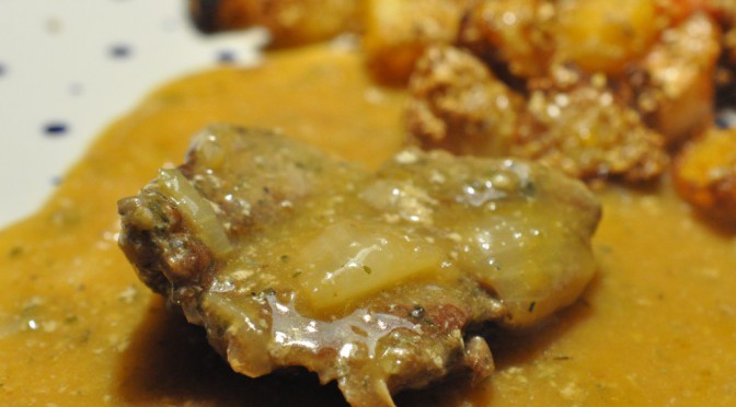 En lækker menu – marinerede oksebovsteaks i flødesovs med løg og serveret med sesamkartofler med paprika.