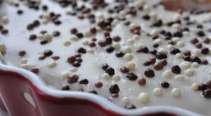 Denne kage nød vi bare med chokoladestriber ovenpå, men du kan også pynte kagen med f.eks. en Nutellacreme.