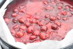 - Tilsæt 1 spsk kold kirsebærsovs af gangen til blandingen, til den er rimelig afkølet. Bland den nu i resten af kirsebærsovsen. Fordel kirsebærsaucen på den afkølede kage. Lad kagen afkøle i minimum 1 time eller til geleen er tyknet