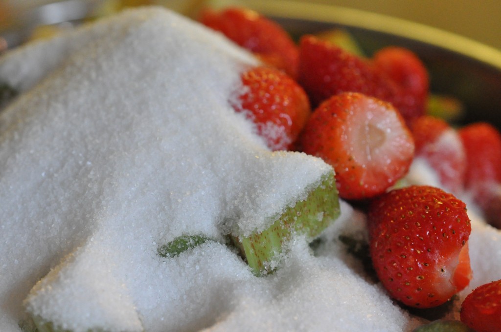 300 gr sukker (prøver at se om det er nok første omgang, ellers må der smages til? (efterskrift : jeg endte med 1 kg sukker eller deromkring. Rabarber kræver MEGET sukker! Smag til flere gange undervejs)