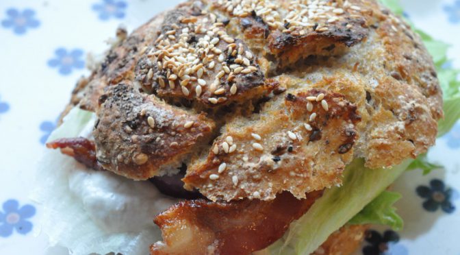 Sikke en lækker sandwich! Koldhævet sandwichbrød er perfekt at bruge til sandwich med hønsesalat og bacon.