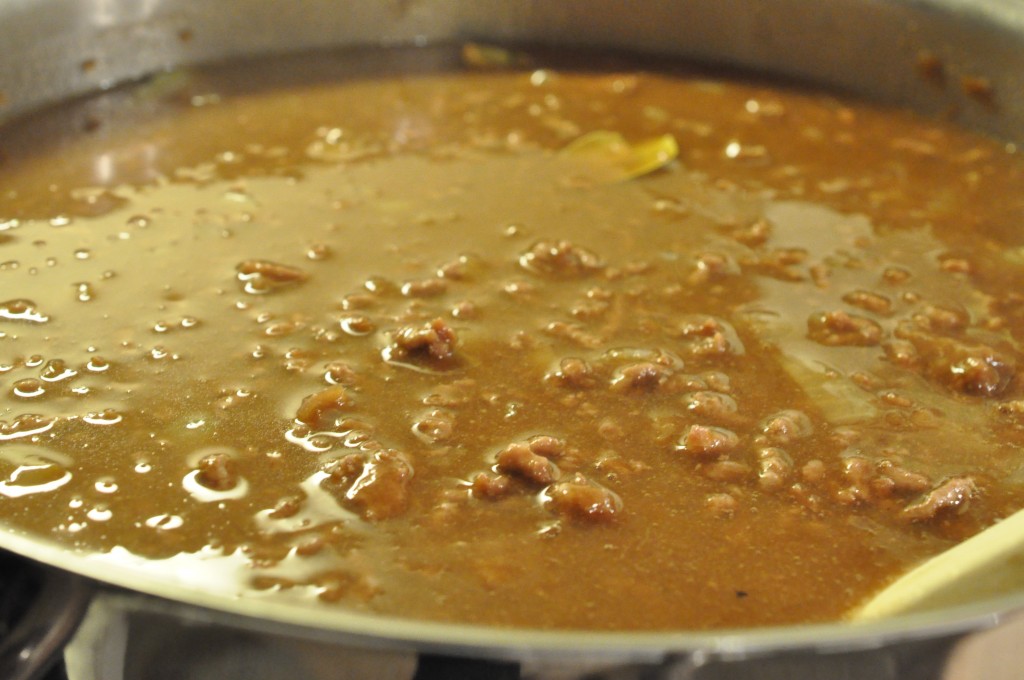 Billedet her viser kæmpegryden fyldt til randen med milionbøf, og tænk at næste det hele blev spist rub og stub?! Jeg kogte 2 kilo spaghetti til, og det viste sig at være passende til 22 gæster.
