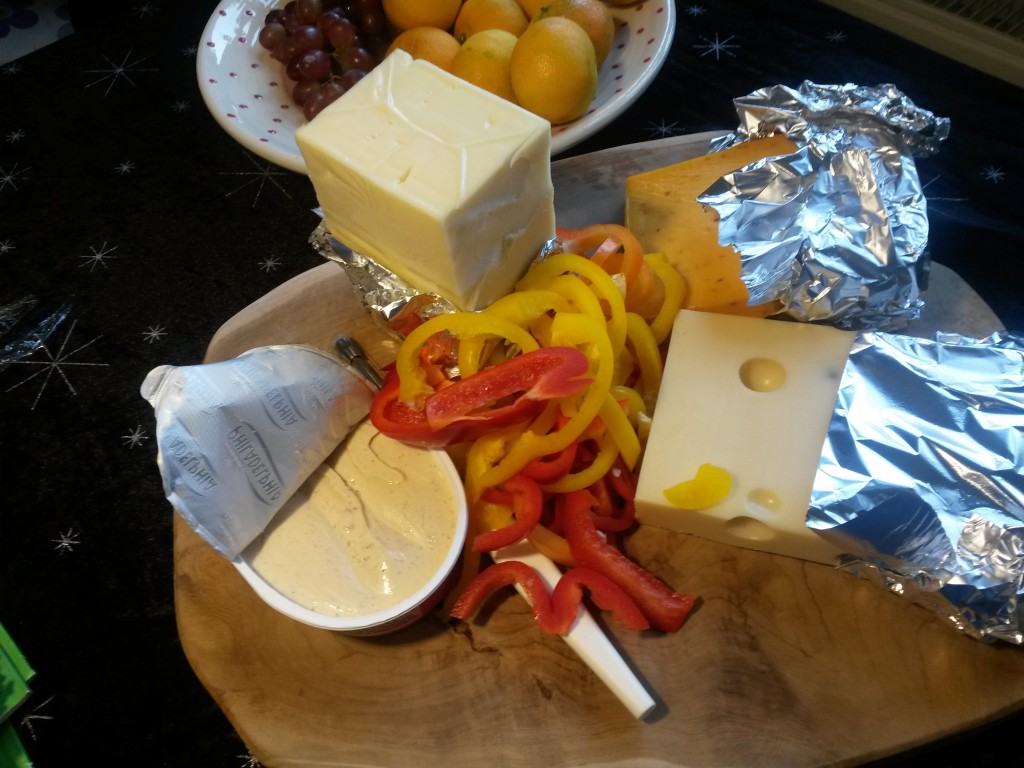 Ostebordet anrettede vi også selv med gode oste. Emmenthaler, chiligouda, og god Riberhus. Da vi nåede til osten havde vi dog ikke så stor appetit længere. Hvorfor mon ikke? Uha synes tit det går sådan med osteborde 😉