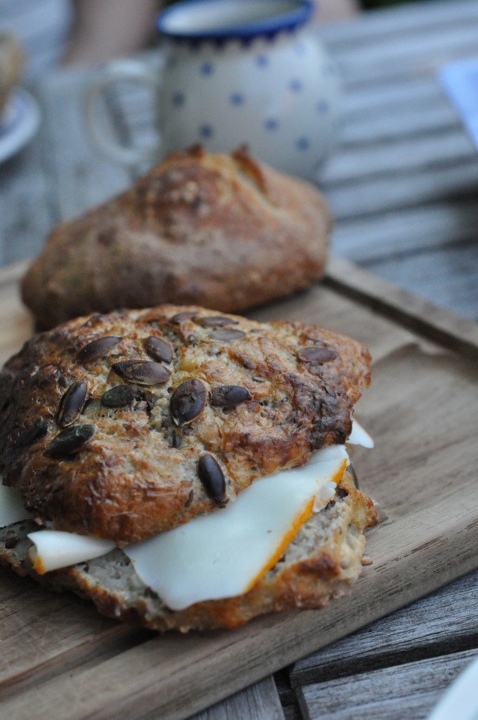 Vi spiser sen brunch, har ikke travlt, det er fridag. Skønt! Tager mig tid til at nyde og bruge alle sanser til at dufte, kigge og smage. Nyder den gode tid og bemærker at også brød bliver meget smukkere i det fri. 🙂