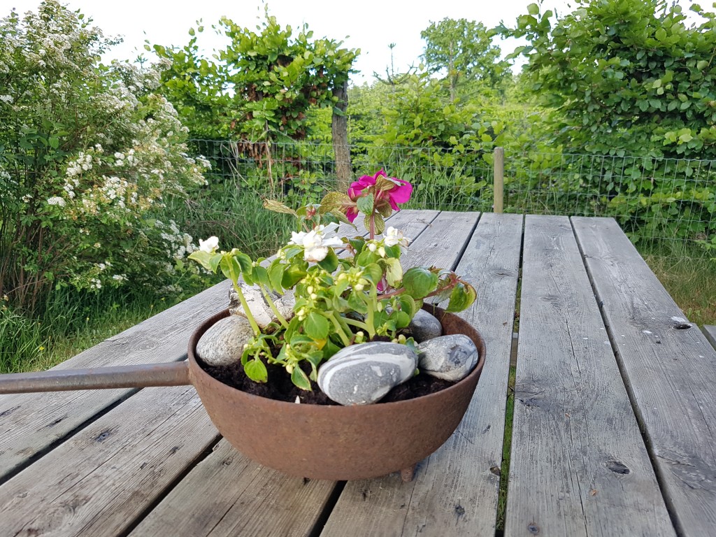 Indtil sparegrisen er fyldt, nyder jeg udsigten fra mine havebænke og frydes over det jeg har. Det er vigtigt at huske på. Glæden over lykken-lige-her, i stedet for at jage lykken et andet sted – siddende på en fiktiv en drømme-terrasse måske?