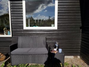 Du skal da lige se glimtet af min nye hyggekrog i sommerhuset. Havebænk nr. 1 placeret i den gode terrassekrog. På udsigtspletten, hvor der er havkig og læ for vinden. Åh hvor er det et fint sted og jeg har en fryd, når jeg sidder der på bænken og læser i min bog eller blot drikker en kop te.Polyrattan er måske ikke det smukkeste i verden, til gengæld er det en ægte “smæk stængerne op” driver-bænk, for den skal aldrig nogensinde males jo. Nogen af os har med årene lært at sætte pris på lidt. Havemøbler-af-træ-der-skal-olieres…..Been there, done that. Jeg er videre i livet og polyrattan har vundet mig 🙂
