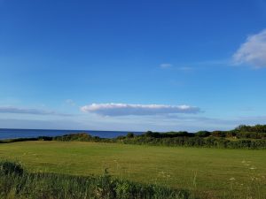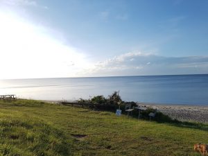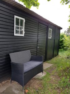 Der er den skønneste udsigt fra denne bænk – Man kan skue ud over havens grønne og se vandet også. Der er også læ, på bænken foran haveskuret. En skøn plet.