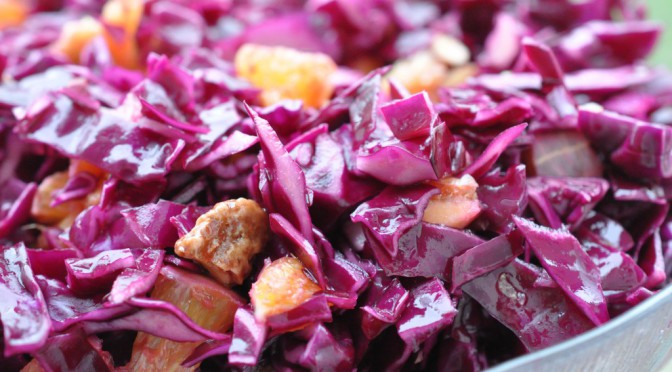 Appelsinen giver en rigtig fin kontrast til den lidt bitre kraftige rødkål. Du kan sagtens også bruge mandariner til salaten.