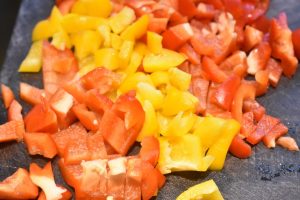 • Klip baconskiverne i små stykker og svits med løg og hvidløg. Tilsæt herefter champignon og peberfrugt