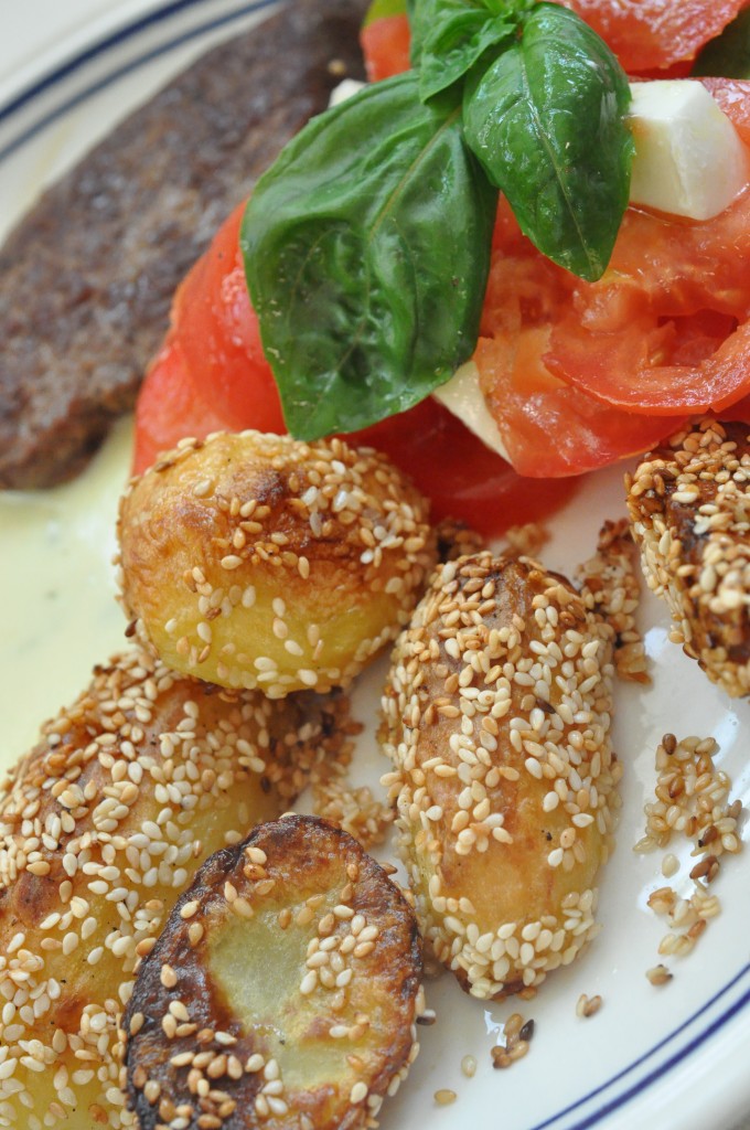 Familiens yndlingskartofler: Ovnkartofler med sesam. Hertil spiste vi den smukke enkle tomatsalat med mozzarella og basilikum, steaks af tyksteg og bearnaisesauce. En skøn og sommerlig menu, der smagte skønt på terrassen.