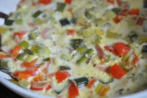 Nem ovnbagt æggekage med spidskål, bacon, creme fraiche og grøntsager