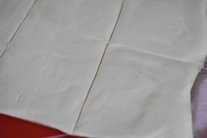 Rul butterdejen ud og skær den ud i 8 lige store firkanter. Brug evt. linial, så alle stykkerne bliver lige store