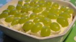Pynt kagen med halverede vindruer eller friske bær, vælg gerne syrlige bær, da kagen er ret sød. Opbevar kagen på køl, til den skal serveres.