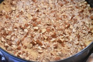 Smør et tærtefad eller en springform og hæld dejen heri. Min form målte 24 cm. i diameter Hak mandlerne groft og drys dem på kagedejen. Tryk mandelstykkerne godt ned i dejen. Drys med perlesukker