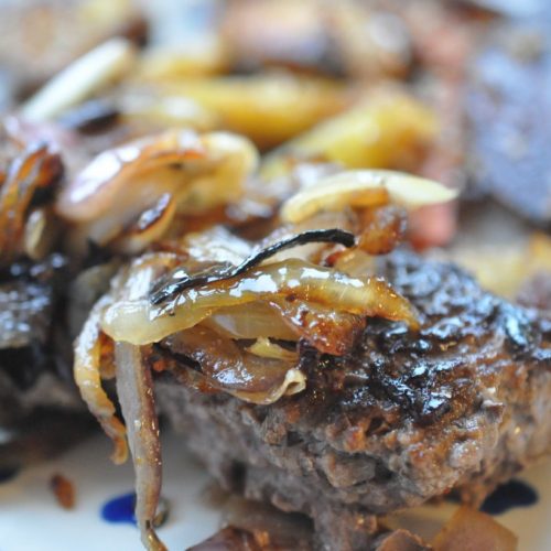 Fordel nu stegeskyen fra bøfferne godt med løgene. Skub både løg/bøffer lidt rundt på banden, så intet tørsteger.