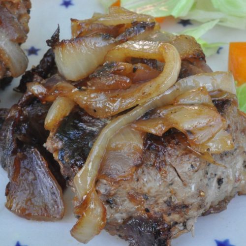 Svits løgene på panden, gerne sammen med bøfferne, hvis der er plads. Hvis ikke, så tag bøfferne af, og læg dem på en tallerken tildækket med stanniol, imens du steger løg.