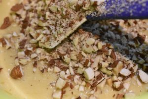 Pisk æg og sukker hvidt og skummende og sigt hvedemelet i. Tilsæt smør/chokoladeblandingen og de grofthakkede mandler