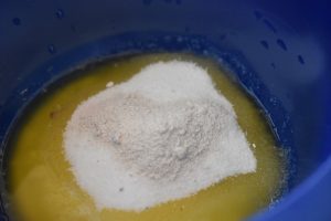 Pisk æggene i. Jeg brugte en gaffel, men du kan også bruge en dejspatel eller en elpisker. Bland bagepulver med hvedemelet og rør det i sammen med kokosmelet. Tilsæt mælken lidt efter lidt