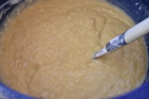 Smelt smørret i mikrobølgeovnen eller i en gryde og rør sukker og vaniljesukker i
