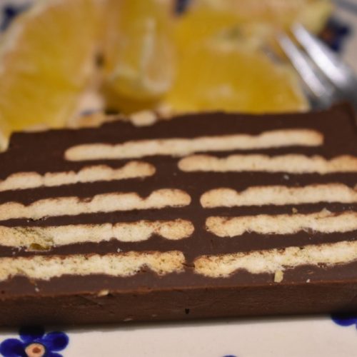 Smør et et tyndt lag i bunden, læg kiks på, chokoladecreme på og fortsæt til du kan afslutte med et chokoladelag på toppen. Glat toppen og enderne fint med dejskraberen.