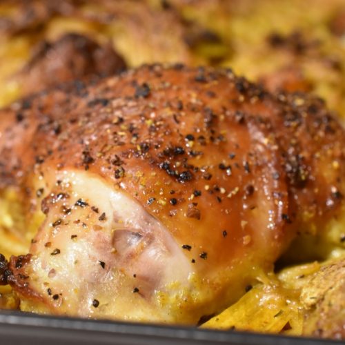 - Ca. 1,5 kg parteret kylling (jeg brugte 4 lår og 4 kyllingeoverlår) du kan bruge kyllingebrystfilet, men så skal retten have lidt kortere tid