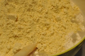Rør gæren ud det lunkne vand/tykmælk. Tilsæt sukker, majsmel og hvedemel lidt efter lidt, sammen med salt. Rør til melet er opløst.
