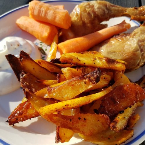 - 2 kg kartofler skåret i tynde smalle stave søde kartofler kan også bruges