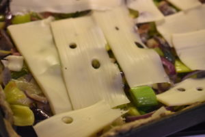 Bland nu æggeblandingen og hæld den over tærten med fyld og ost