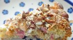 Hæld dejen i fadet og tryk resten af rabarberstykkerne godt ned i dejen.