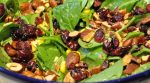 Tilsæt majs og læg saltmandler og tranebær på toppen. Spinatsalaten er nu klar til servering