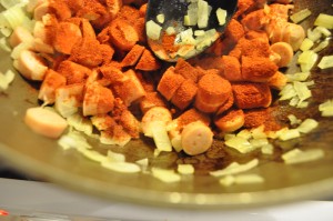 Snit løg og pølser og svits i smør. Paprika svitses med.