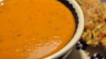 Lækker, kraftig tomatsuppe med peberfrugt, hvidløgsost og fløde.
